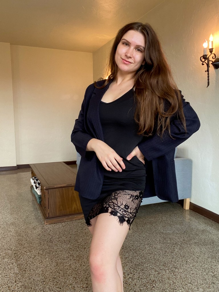 Next, I found a simple little black dress with lace detailing for $3.99. While browsing the clearance rack, I found an oversized vintage blazer to go with it for just $1.99. I think this look would be perfect for grabbing dinner.