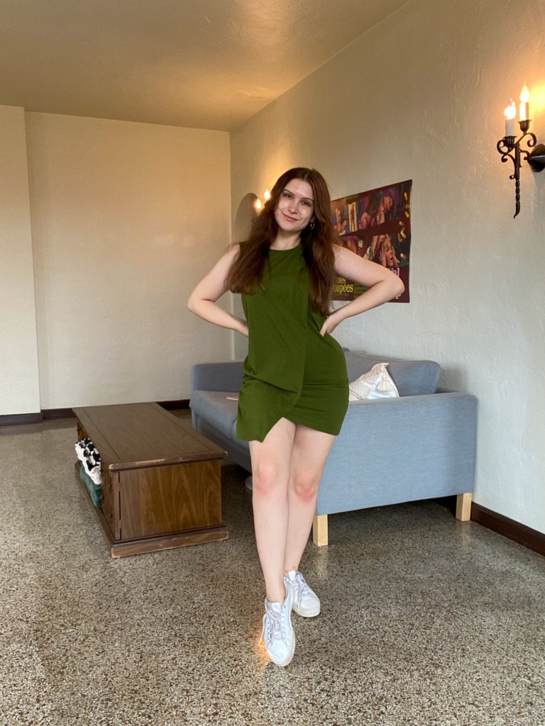 First, I found this asymmetrical olive green dress. It was originally from J.Crew where dresses can easily cost more than $100. I scored this dress for just $8.99. I really enjoy the unique cut and color. This dress pairs perfectly with just tennies, but I could also dress it up with heels.